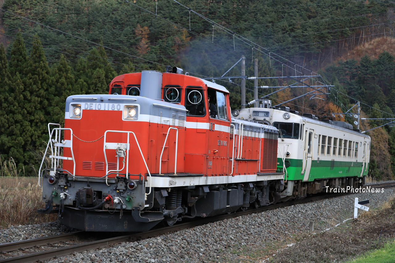 2018年11月16日 2018/11/16運転 キハ40-2086交検出場配給 配9225レ DE10-1180+キハ40-2086配9225レ DE10-1180+キハ40-208611月16日、郡山総合車両センターに所属し同会津若松派出所に常駐するキハ40-2086が郡山総合車両センターでの交番検査を終えて、郡山~会津若松間で配給輸送された。全区間で同区のDE10-1180が牽引した。通常は自走で回送される所、空転対策で機関車牽引による配給列車としての運転となった。 タグ :#JR東日本 カテゴリなしの他の記事 < 前の記事次の記事 >