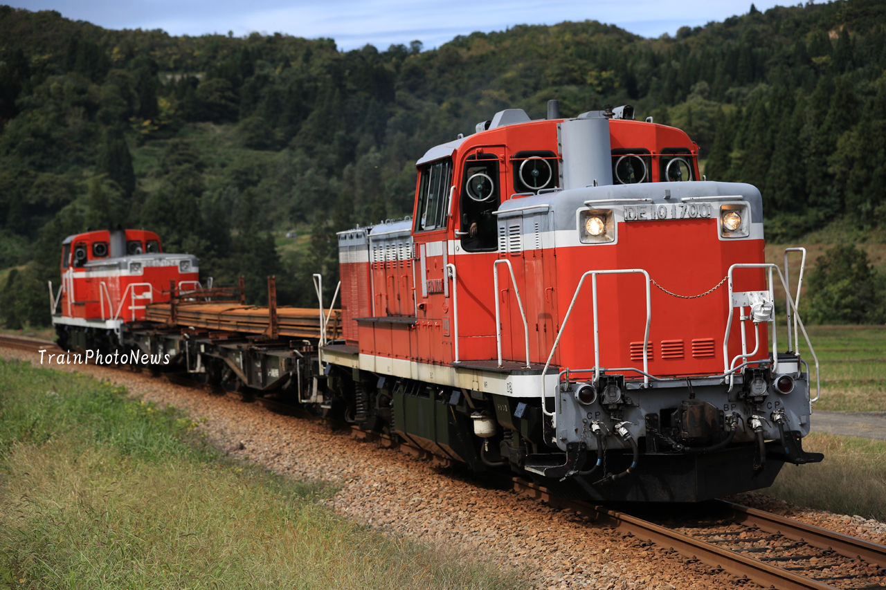 2019年10月11日 2019/10/11運転 只見チキ工臨 工9434レ DE10-1700+チキ5200形2B+DE10-1124工9434レ DE10-1700+チキ5200形2B+DE10-112410月11日、新津~小出~只見間の往復(只見にてレール積み下ろし)で工事臨時列車が運転された。幕張車両センター所属で越中島貨物に常駐するチキ5200形2両(定尺レールチキ)を牽引するもので、全区間で長岡車両センターのDE10-1700と郡山総合車両センターのDE10-1124がプッシュプルで牽引した。 タグ :#JR東日本 カテゴリなしの他の記事 < 前の記事次の記事 >