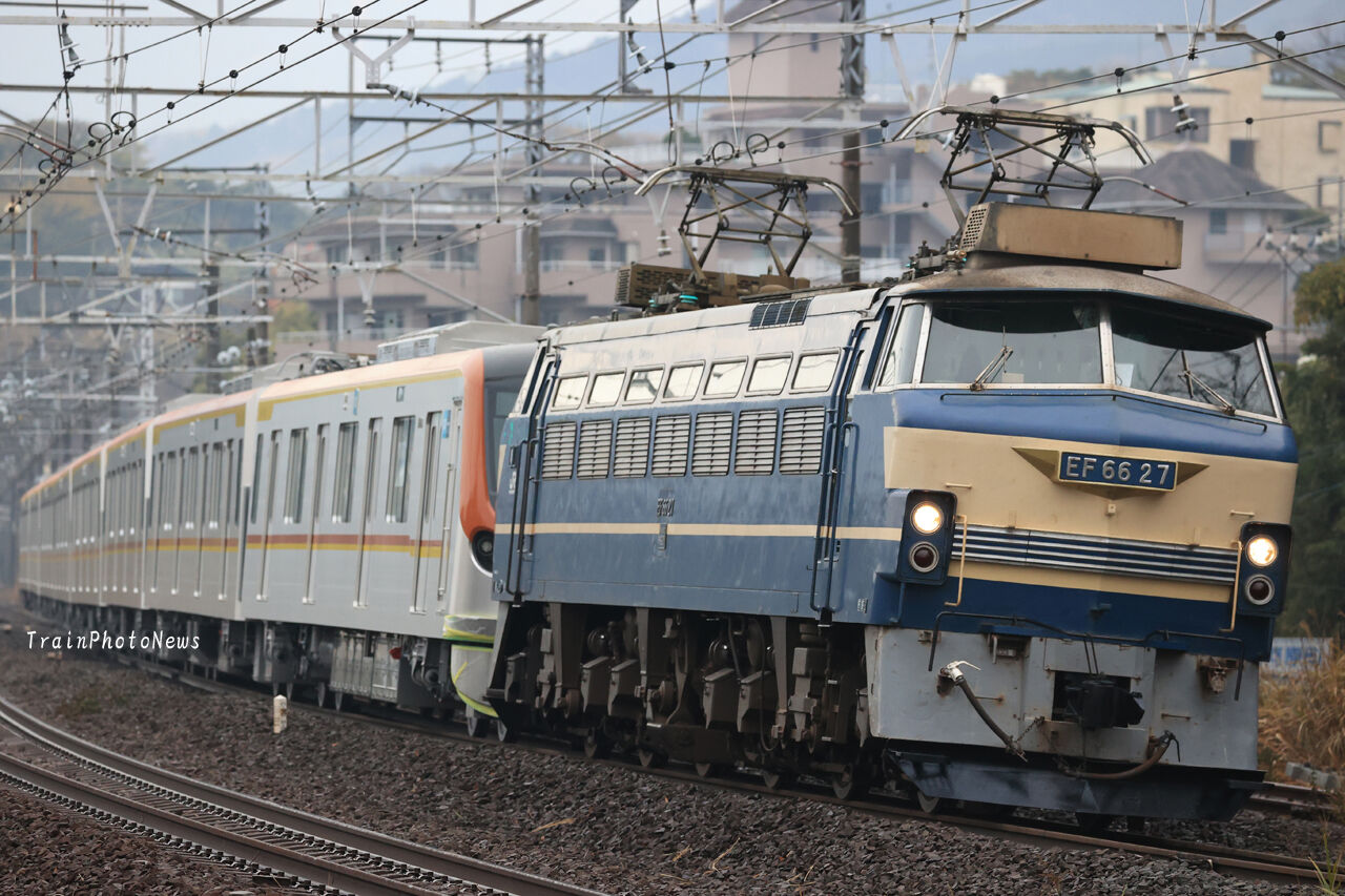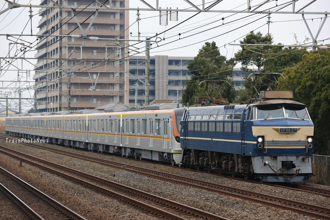 2021年12月25日 2021/12/24~25運転 東京メトロ17000系甲種輸送(関東) 8860レ EF66-27+東京メトロ17000系8B8860レ EF66-27+東京メトロ17000系8B12月24日から25日にかけて、近畿車輛で落成した東京メトロ17000系8両が徳庵~吹田貨物ターミナル~横浜羽沢~綾瀬間で甲種輸送された。このうち吹田貨物ターミナル~横浜羽沢間は吹田機関区のEF66-27が牽引した。 タグ :#JR貨物#私鉄#JR西日本#JR東海#JR東日本 カテゴリなしの他の記事 < 前の記事次の記事 >