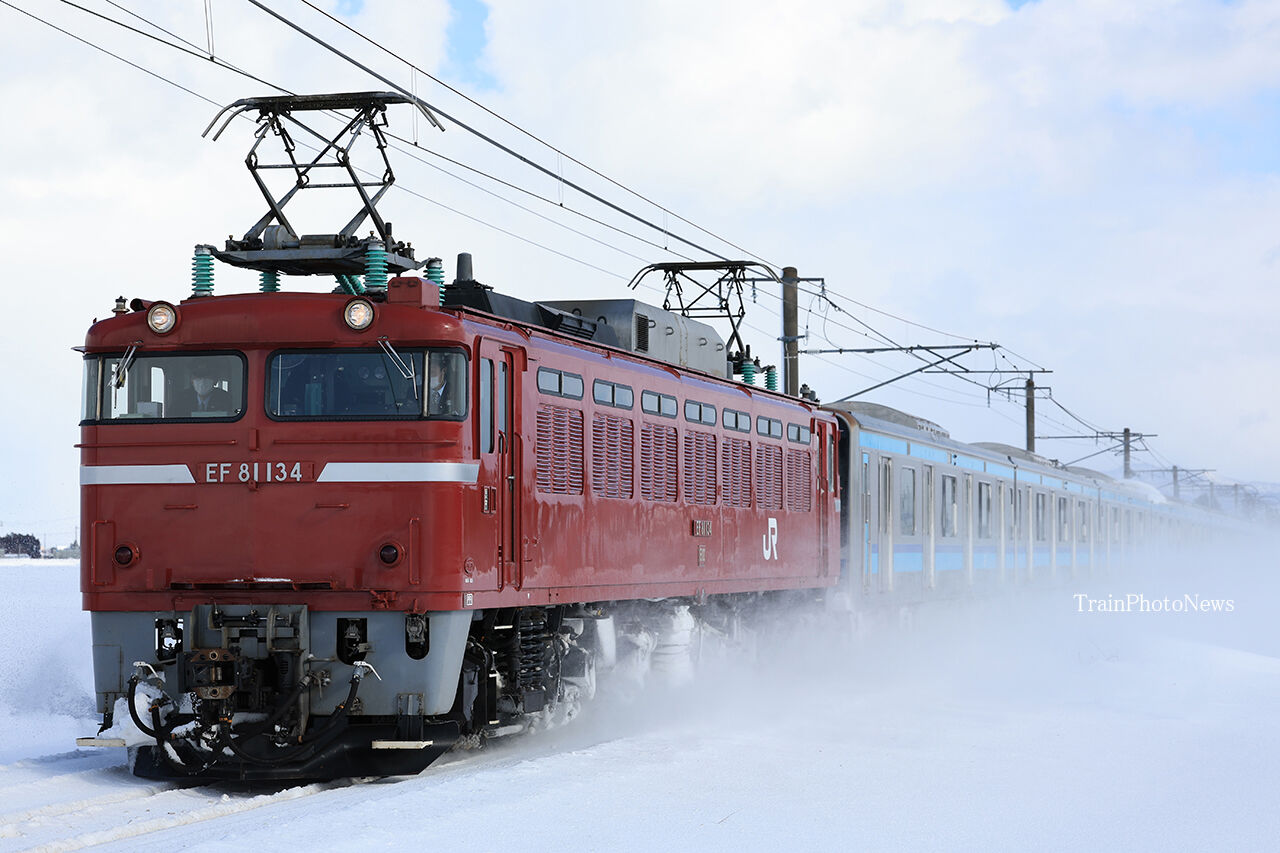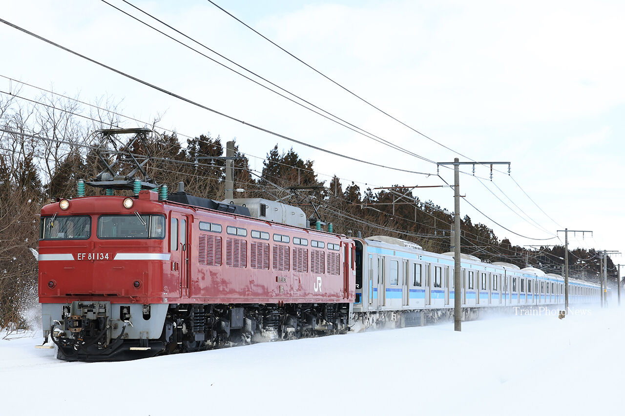 2023年01月31日 2023/1/31運転 E231系800番台ミツK3編成秋田出場配給 配9822レ EF81-134+E231系10B(遅延+10分)配9736レ EF81-134+E231系10B配9736レ EF81-134+E231系10B(遅延+15分)1月31日、三鷹車両センターに所属するE231系800番台10両(ミツK3編成)が秋田総合車両センターを出場し土崎~新津~大宮~田端操~南流山~東大宮操間で配給列車として運転された。全区間で長岡車両センターのEF81-134が牽引した。 タグ :#JR東日本 カテゴリなしの他の記事 < 前の記事次の記事 >