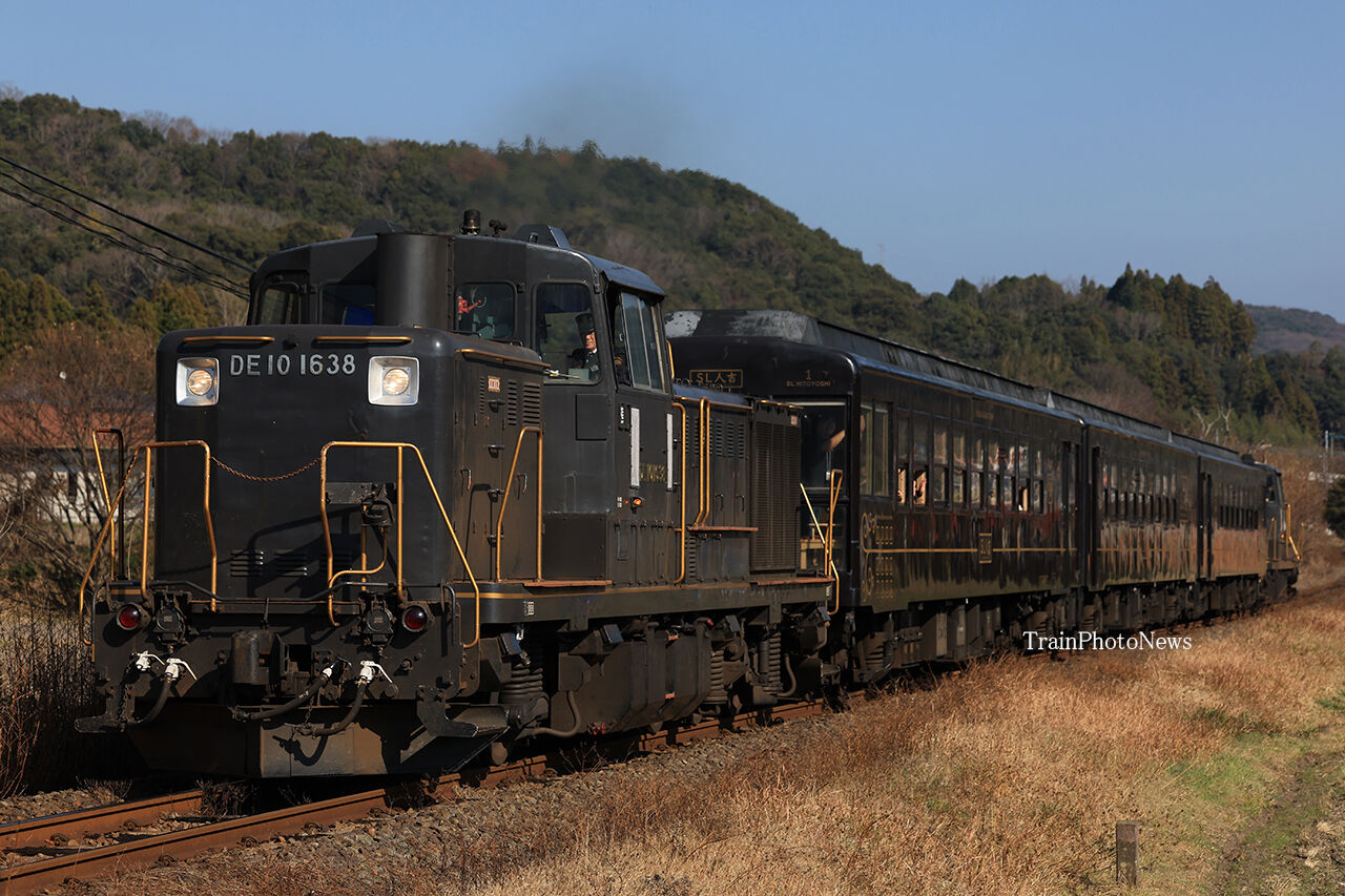 2023年12月27日 2023/12/27運転 50系人吉客車由布院団臨 9942レ DE10-1638+50系改3B+DE10-12099942レ DE10-1638+50系改3B+DE10-1209(後方撮影)9943レ DE10-1209+50系改3B+DE10-163812月27日、50系人吉客車を使用した団体臨時列車が門司港~大分~由布院間の往復で運転された。熊本車両センターのDE10-1638とDE10-1209がプッシュプルで同区の50系改造客車3両(SL人吉客車)を牽引した。ヘッドマークは掲出されなかった。 タグ :#JR九州 カテゴリなしの他の記事 < 前の記事次の記事 >