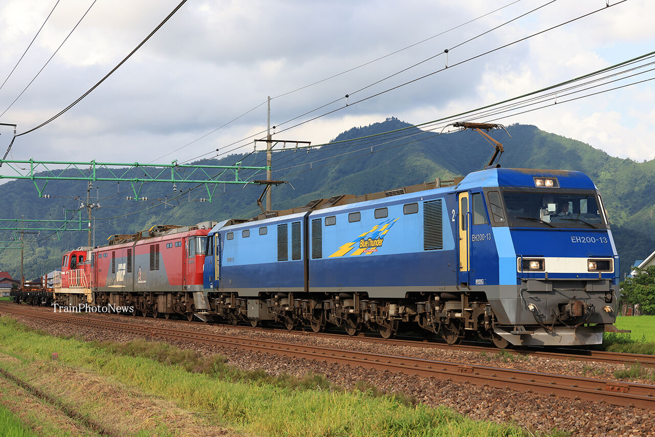 2024年07月20日 2024/7/20運転 EH200+EH500+DD200+チキ配給 配8788レ EH200-13+EH500-49+DD200-14+チキ7000形2B配8788レ EH200-13+EH500-49+DD200-14+チキ7000形2B配8788レ EH200-13+EH500-49+DD200-14+チキ7000形2B7月20日、高崎機関区のEH200-23が門司機関区のEH500-49と愛知機関区のDD200-14と川崎貨物常備のチキ7000形2両をを牽引する予定臨時配給列車が新潟貨物ターミナル~南長岡~高崎操間で運転された。 タグ :#JR貨物#JR東日本 カテゴリなしの他の記事 < 前の記事次の記事 >