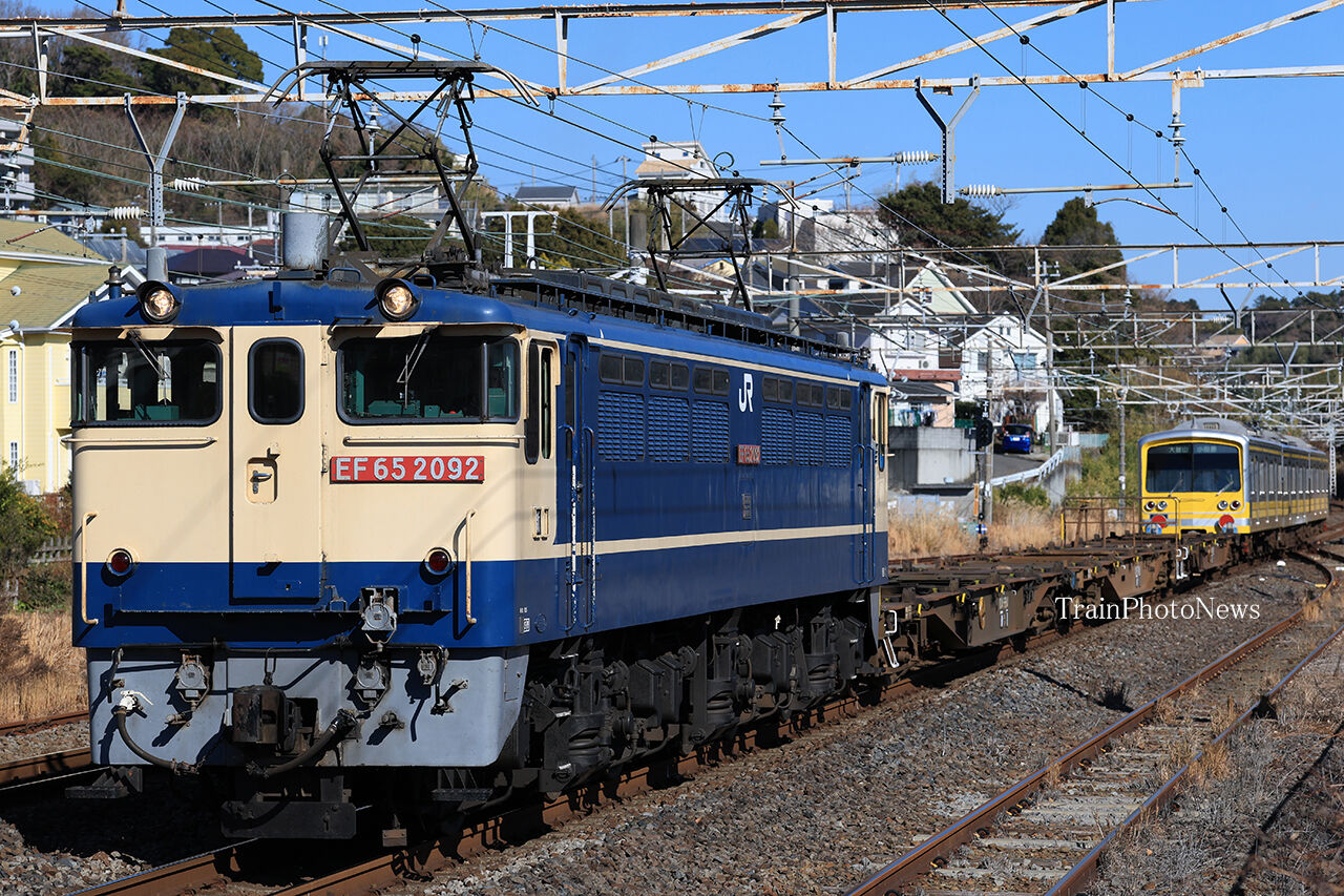 小田原~三島間をJR貨物新鶴見機関区のEF65-2092(コキ104形3両を控え車として連結)が、